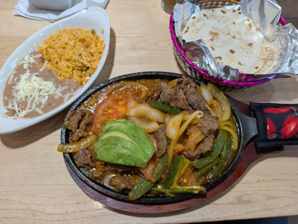 This is a ribeye cooked on a cast iron skillet with onion, tomato, jalapeño, avocado, and grilled vegetables. It arrived sizzling and looked exactly like the menu photo, which is always a good sign. The steak was tender, well-seasoned, and the combination of the savory beef with the brightness of tomato and the richness of avocado worked really well together. It comes with rice and beans on the side, and a basket of warm flour tortillas. A genuinely satisfying plate.
