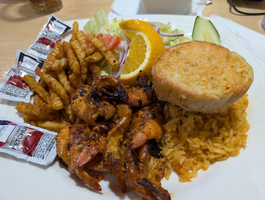 Grilled shrimp prepared Nayarit-style, served with rice, fries, a small side salad, and a piece of garlic bread. The shrimp had great char and the Nayarit-style preparation gives it a smoky, slightly spiced flavor that you do not get at most Mexican restaurants. The garlic bread alongside shrimp and Mexican rice is an unexpected combination, but it worked. The portion was solid for the price.