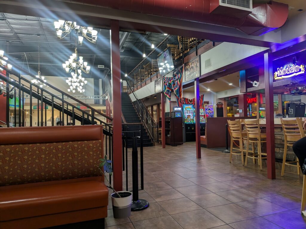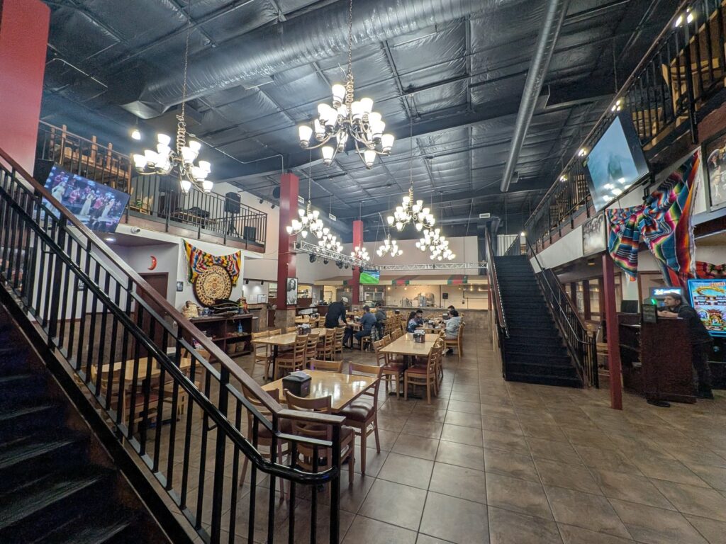 When we visited on a Friday evening close to closing, it was quiet. That actually made for a relaxed dinner experience. The dining room has a mix of booth and table seating, and the atmosphere has a casual but lively feel — colorful woven textiles on the walls, TVs showing sports, and the kind of energy you’d expect from a restaurant that really comes alive on a busy Saturday night in July.