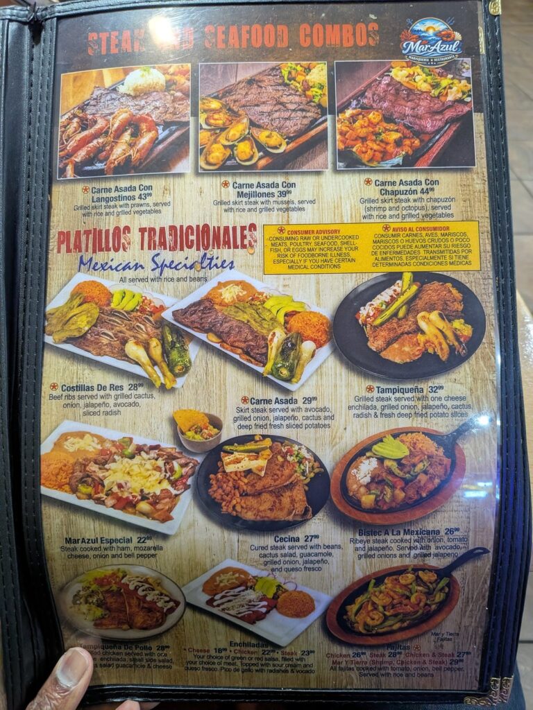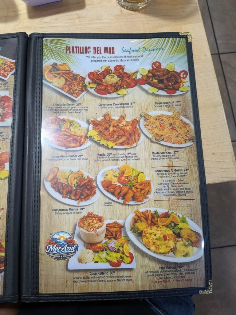 MarAzul is a Marisquería, meaning its specialty is Mexican seafood cooking in the coastal Nayarit tradition. Think grilled shrimp, octopus, molcajetes, and surf-and-turf combinations alongside more traditional Mexican plates like carne asada, fajitas, and enchiladas.